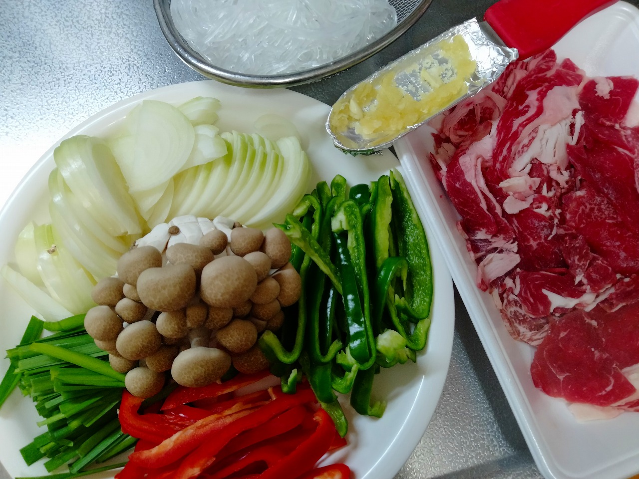 玉ねぎ、ピーマン(赤・緑)、ニラ、しめじ
