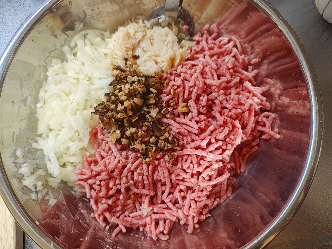 歌ひき肉、玉ねぎ、ホタテ貝柱、干しシイタケを合わせて、