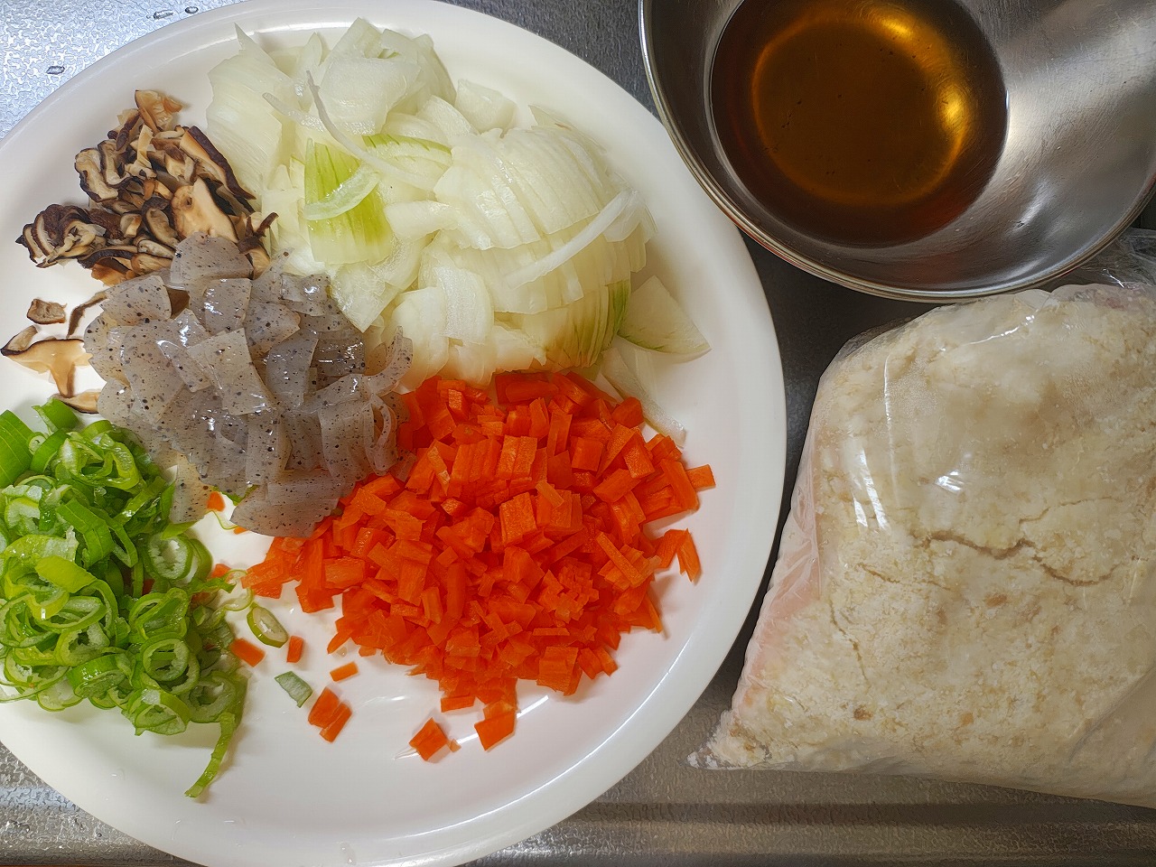 人参、玉ねぎ、こんにゃく、干しシイタケ、ネギと一緒に