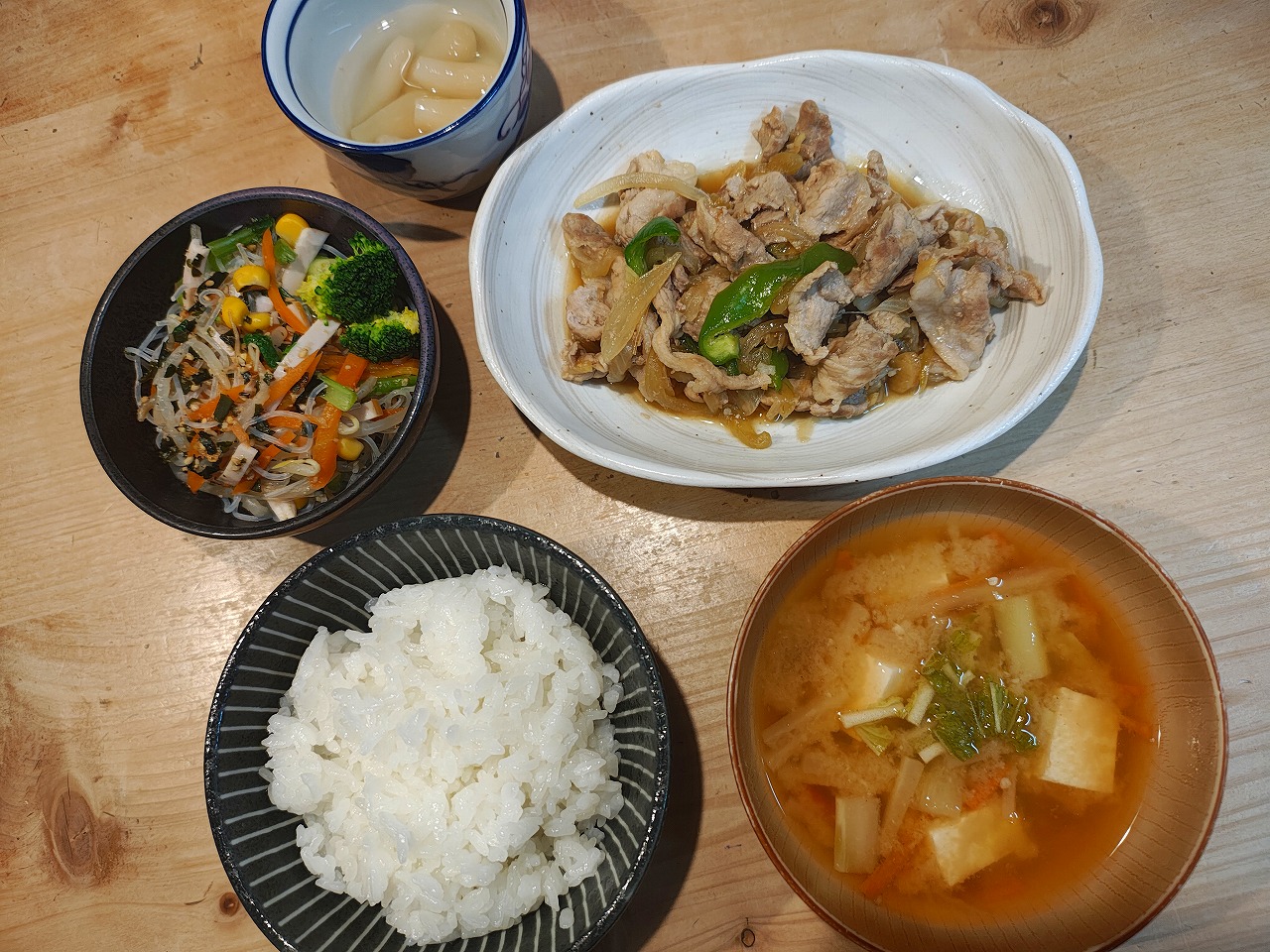 豚肉と玉ネギ炒め 2025/11/19 2025/11/19 献立 夕ごはんの紹介です。 豚肉と玉ねぎの生姜焼き 生姜たっぷり入れてさっぱり風味。 白いごはんがすすみます。 副菜は春雨のサラダ 春雨、小松菜、もやし、人参、ハム、コーン わかめごはんの素、すりごまを合わせて ごま油と醬油で味付け。 春雨ともやしのサラダ お味噌汁 豚と玉ねぎの生姜焼き献立 ごちそうさまでした。 ブログランキングに参加しております。 よろしければポチッとお願いします。 にほんブログ村 家庭料理ランキング