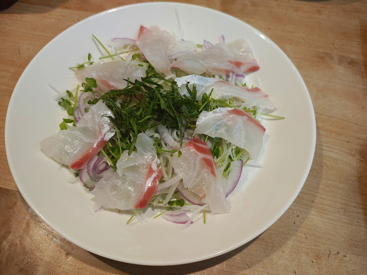 豆苗、大根、赤玉ねぎの上に鯛のお刺身🐟
