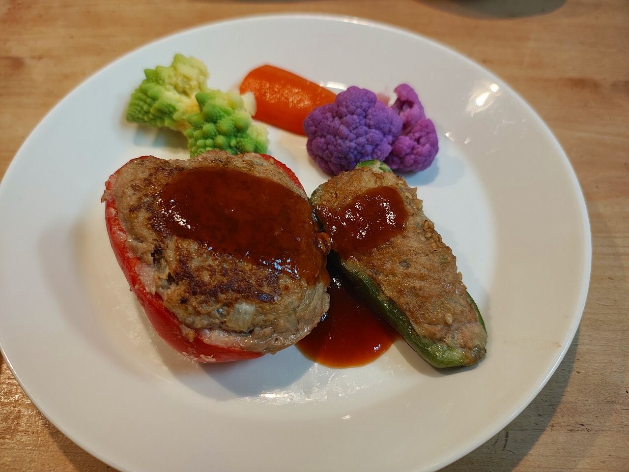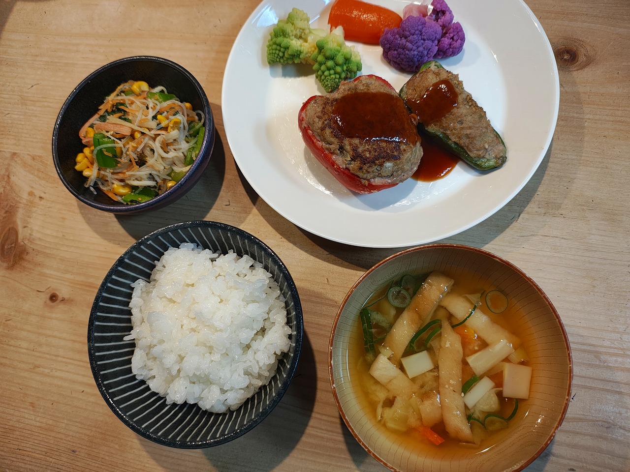 ピーマン肉詰め 2026/1/12 2026/1/12 献立 夕ごはんの紹介です。 パプリカとピーマンが冷蔵庫にあったので、 そこに肉だねを詰めて、焼きました。 ピーマンの肉詰め ピーマンとパプリカの大きさがずいぶん違いますね。 小さいほうが食べやすいかも。 パプリカの肉厚な実も食べ応えがあって良い。 それぞれの良さがあります。 春雨、もやし、人参、小松菜、コーン、カニカマを合わせて 春雨サラダ お味噌汁 ピーマンの肉詰めの献立 ごちそうさまでした。 ブログランキングに参加しております。 よろしければポチッとお願いします。 にほんブログ村 家庭料理ランキング