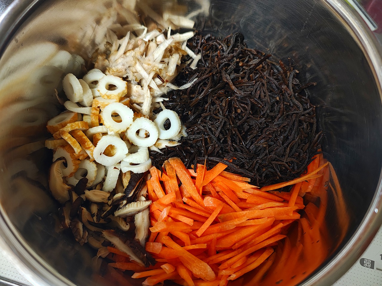 ひじき、人参、干しシイタケ、ごぼう、ちくわを軽く炒めて、