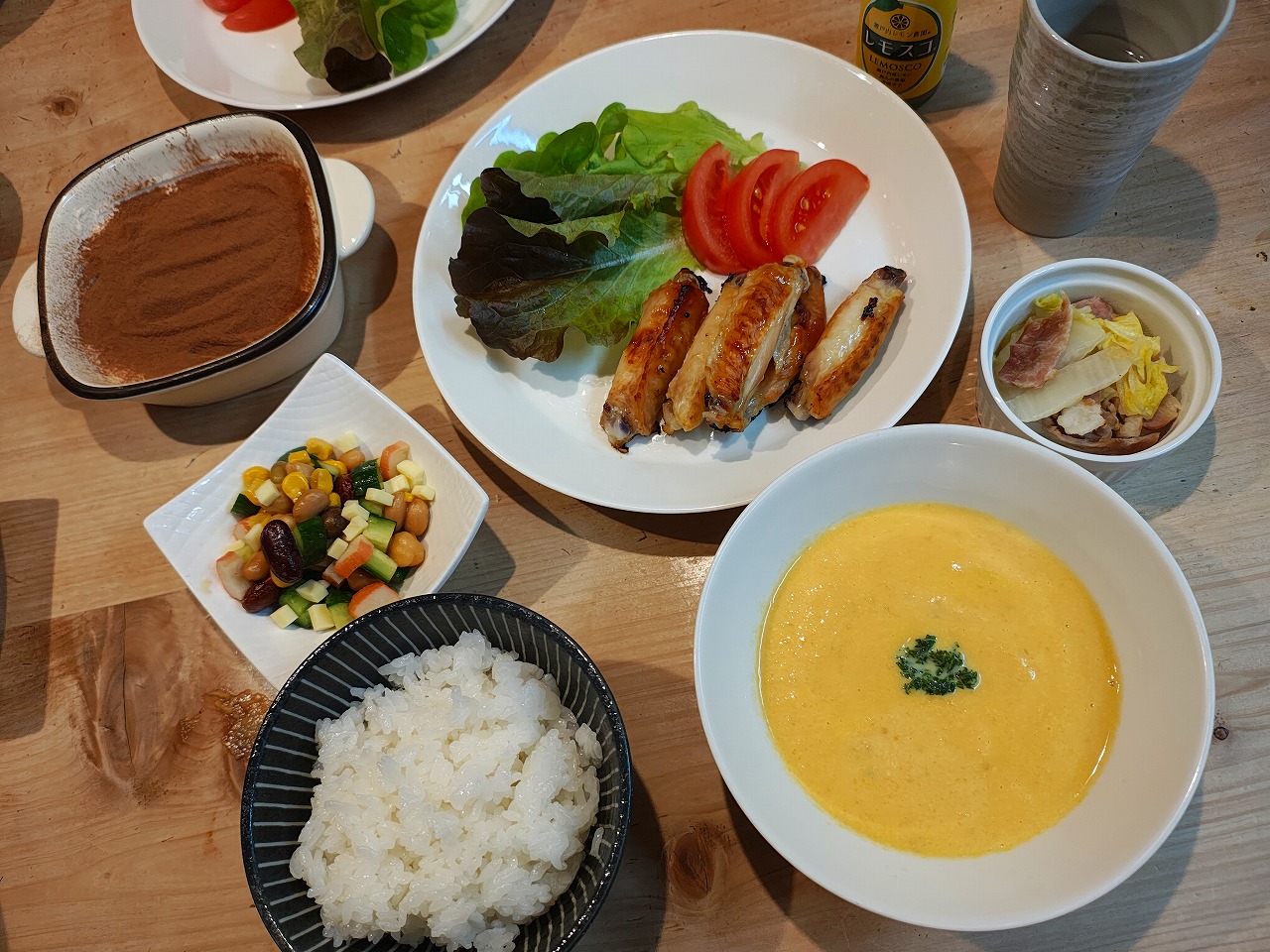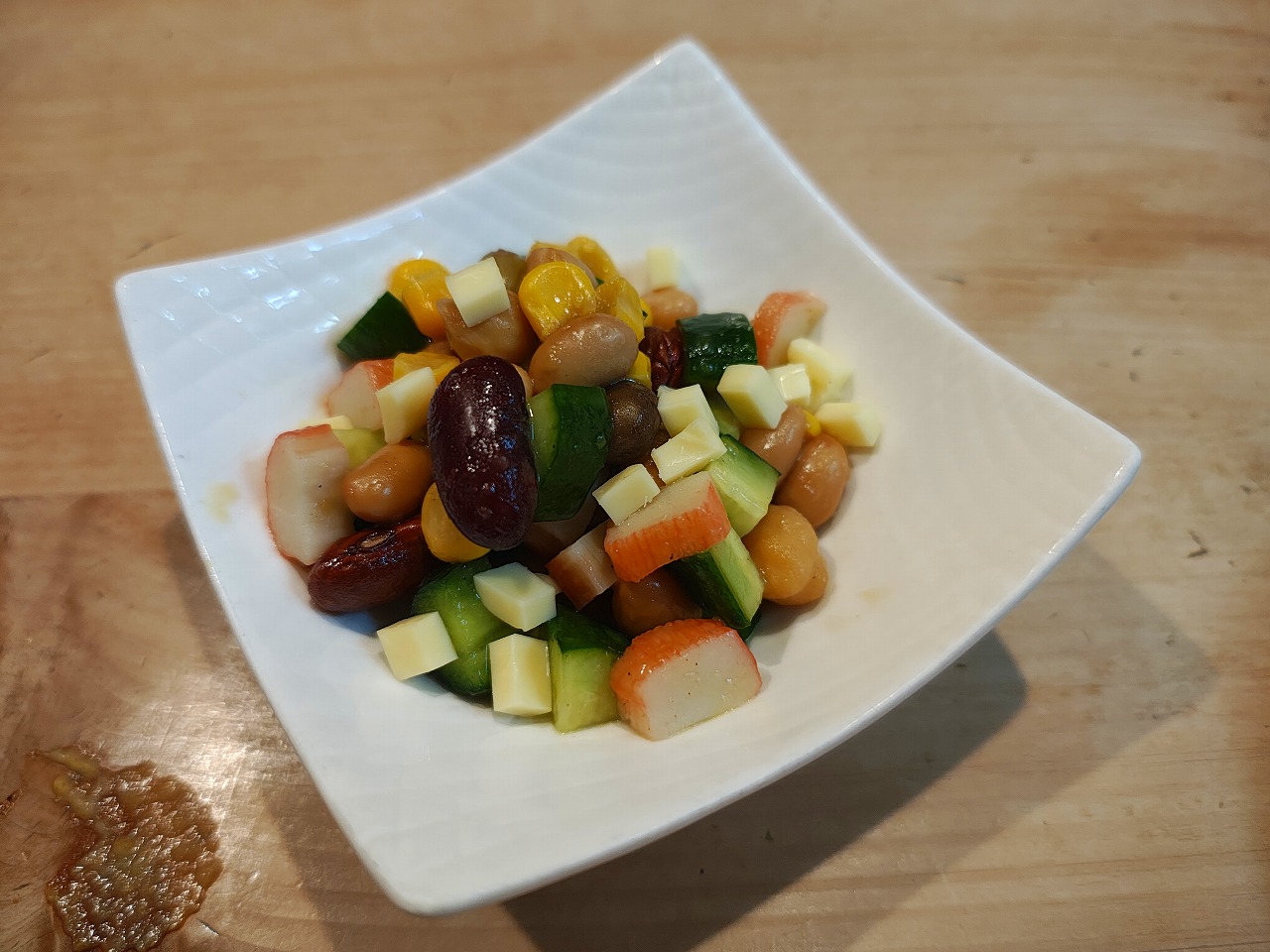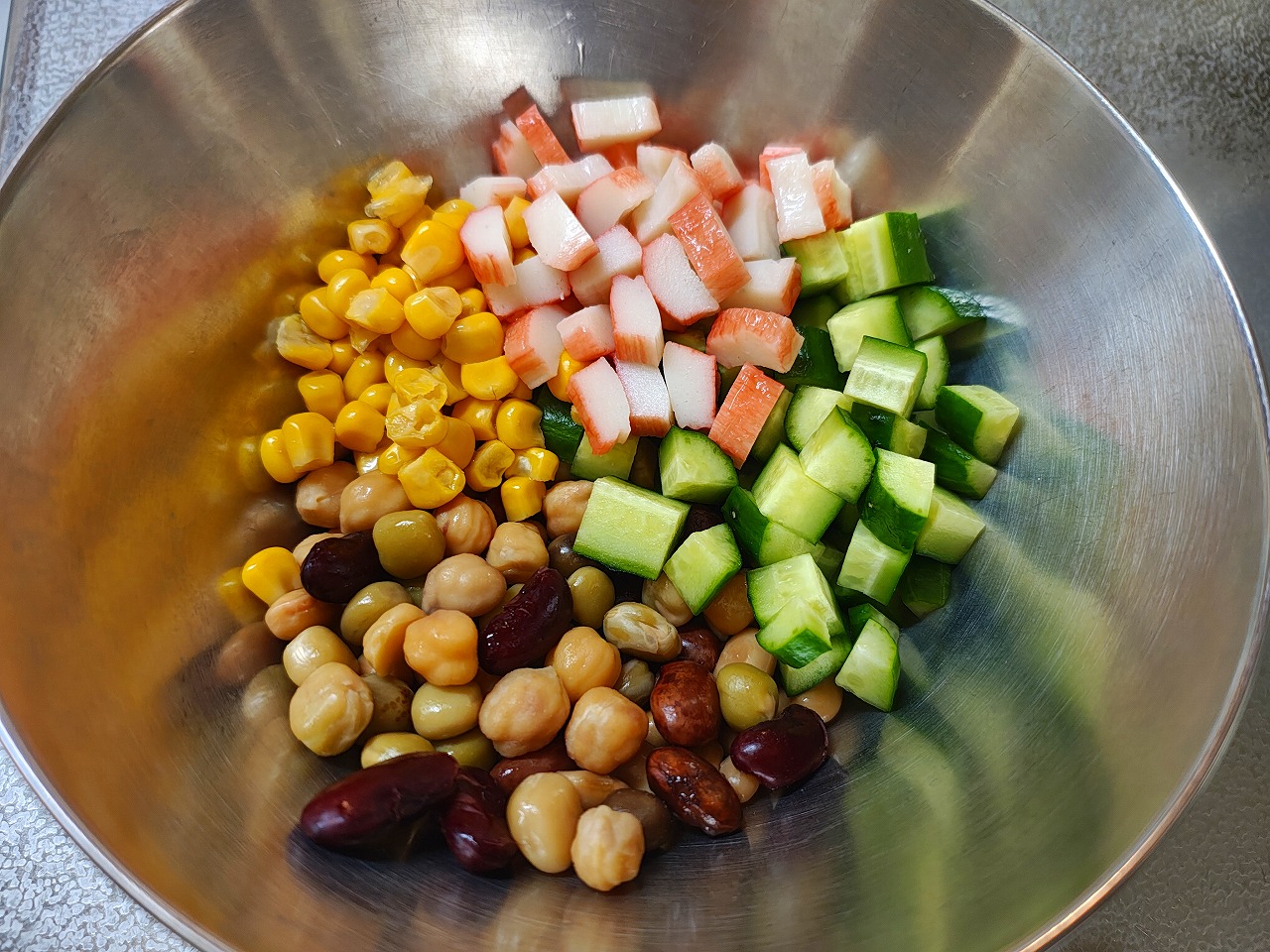 ミックスビーンズ、きゅうり、コーン、カニカマを合わせて