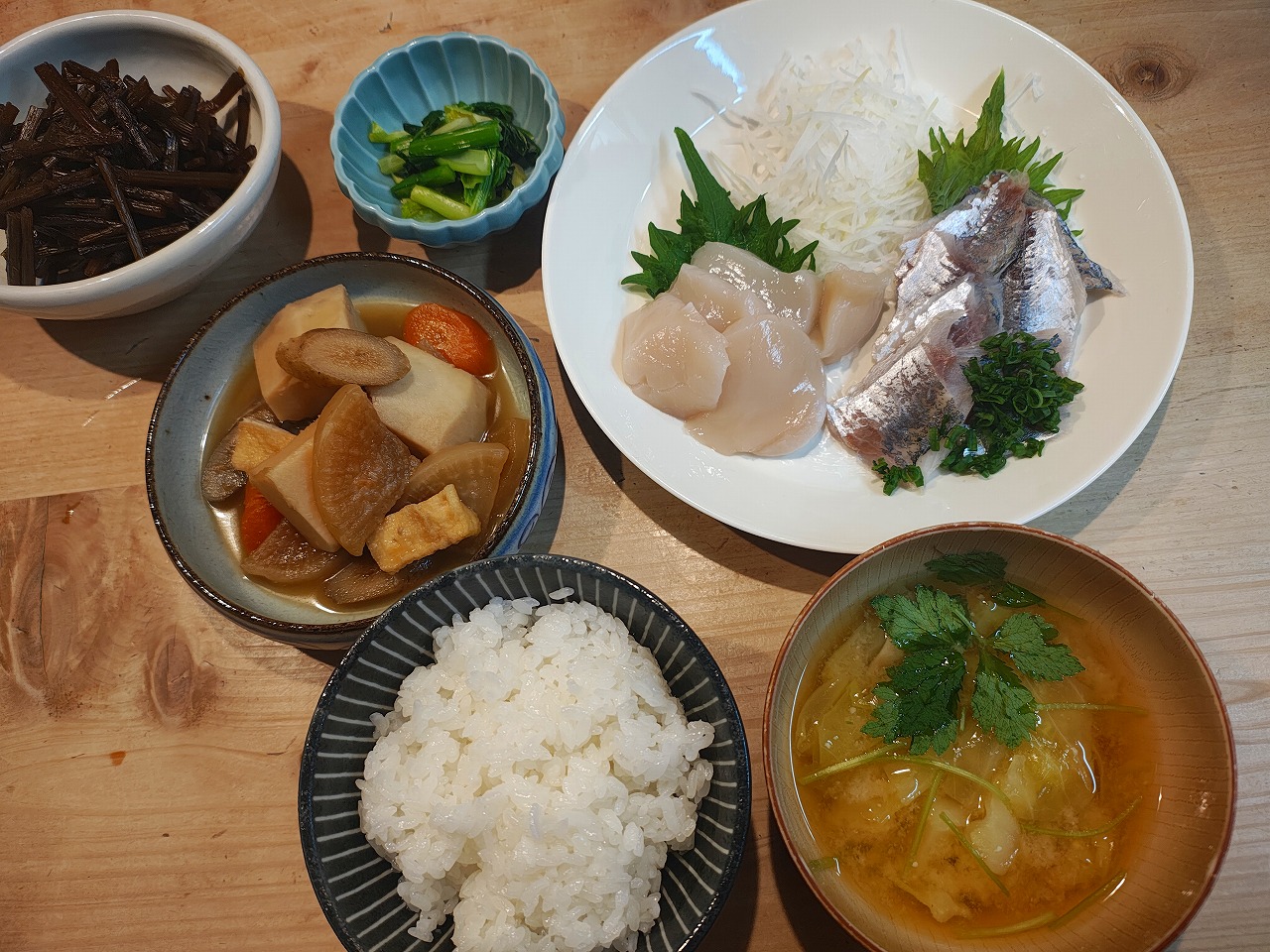 ホタテのお刺身 2026/2/3 2026/2/3 献立 大きなホタテが冷凍で届きました。 解凍して半分にカットし、 あじと一緒に盛り付け。 ホタテとアジのお刺身 甘くてねっとり。 大きい貝柱で食べ応えあり。 従兄弟からもらった里芋 それを使って、他の根菜と一緒に煮ました。 里芋、大根、人参、ごぼう、油揚げ 根菜の煮物 小松菜お浸し 実家の母が作って冷凍してあったもの きゃらぶき お味噌汁 お刺身の献立 ごちそうさまでした。 ブログランキングに参加しております。 よろしければポチッとお願いします。 にほんブログ村 家庭料理ランキング