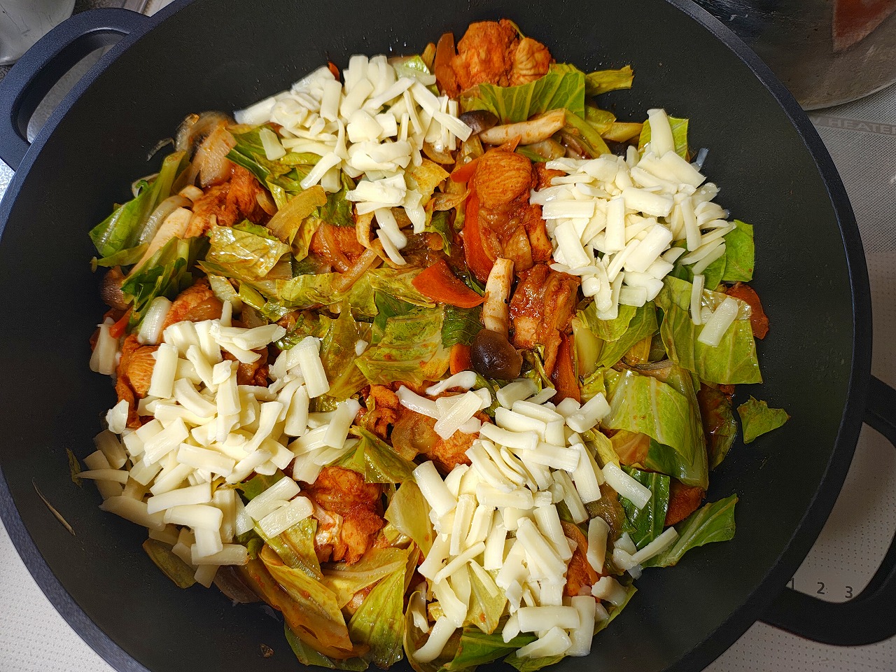 チーズタッカルビ 2026/2/14 献立 夕ごはんの紹介です。 コチュジャンベースのたれに漬け込んだ鶏もも肉を 野菜と一緒に炒めました。 火が通ったらジュレッドチーズをのせて 溶かします。 チーズタッカルビ チーズをからめて辛さがやわらぎます。 寒い時期にホットな辛さ。 良いですね~👍 主菜にもキャベツを使いましたが 副菜にも。 コールスローサラダ お味噌汁 チーズタッカルビの献立 ごちそうさまでした。 ブログランキングに参加しております。 よろしければポチッとお願いします。 にほんブログ村 家庭料理ランキング