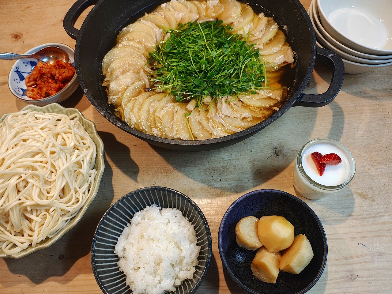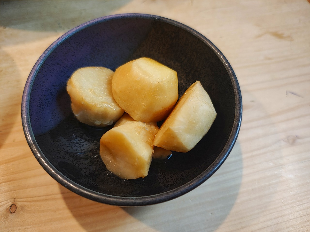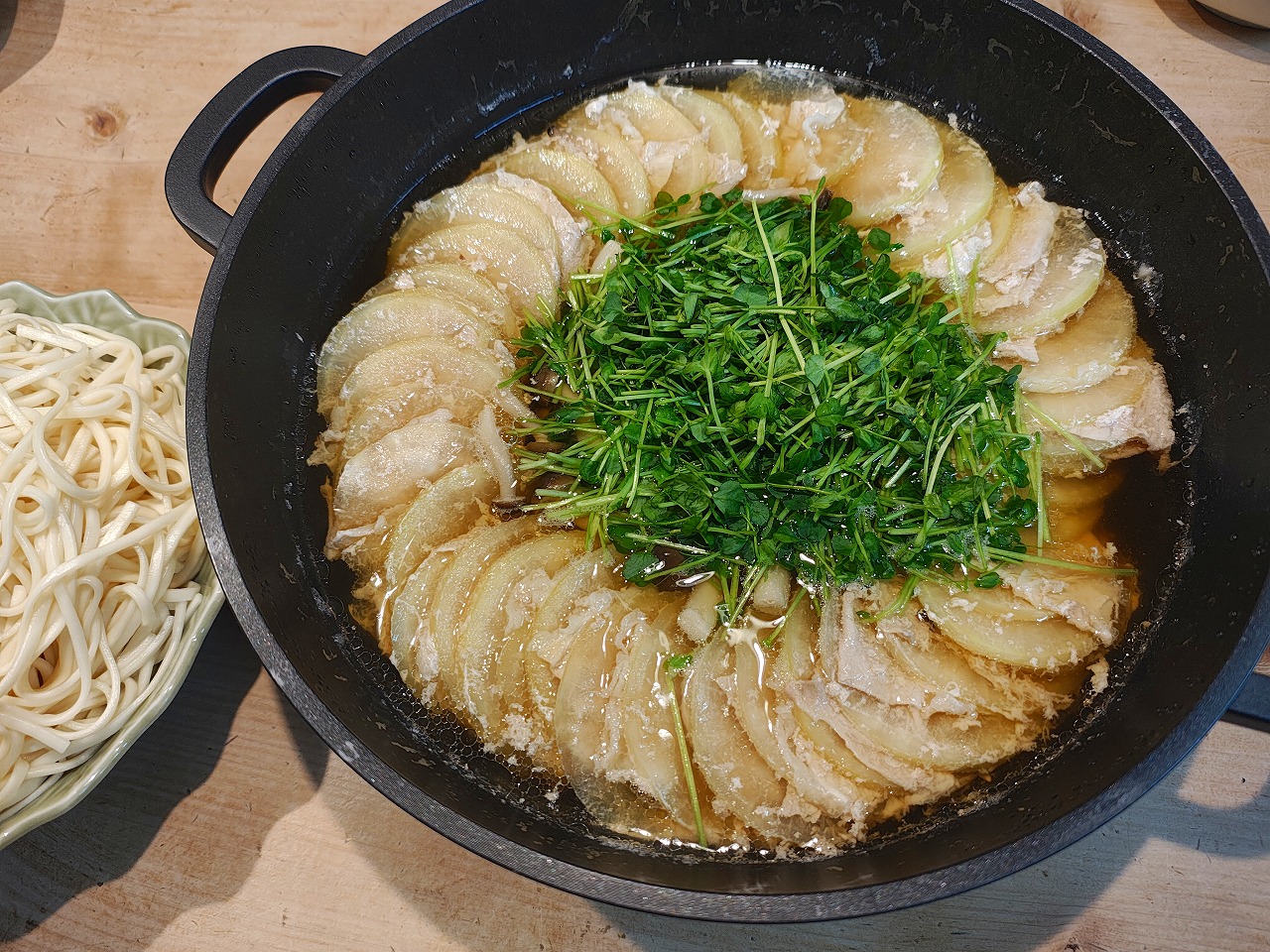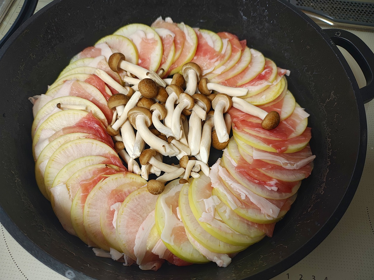 大根と豚肉のミルフィーユ鍋 2026/2/23 2026/2/23 献立 夕ごはんの紹介です。 大根の美味しい季節 大根をたくさん使ってお鍋にしました。 大根の薄切りと豚肉を交互に重ねて 真ん中にはしめじ。 【醤油、砂糖、鶏がらスープ、生姜のすりおろし、ごま油】 を合わせた汁でコトコト煮ました。 最後に豆苗をのせて出来上がり。 大根ミルフィーユ鍋 里芋の煮物 缶詰ミカンを入れた懐かしいのデザート 牛乳かん 大根ミルフィーユ鍋の献立 ごちそうさまでした。 ブログランキングに参加しております。 よろしければポチッとお願いします。 にほんブログ村 家庭料理ランキング