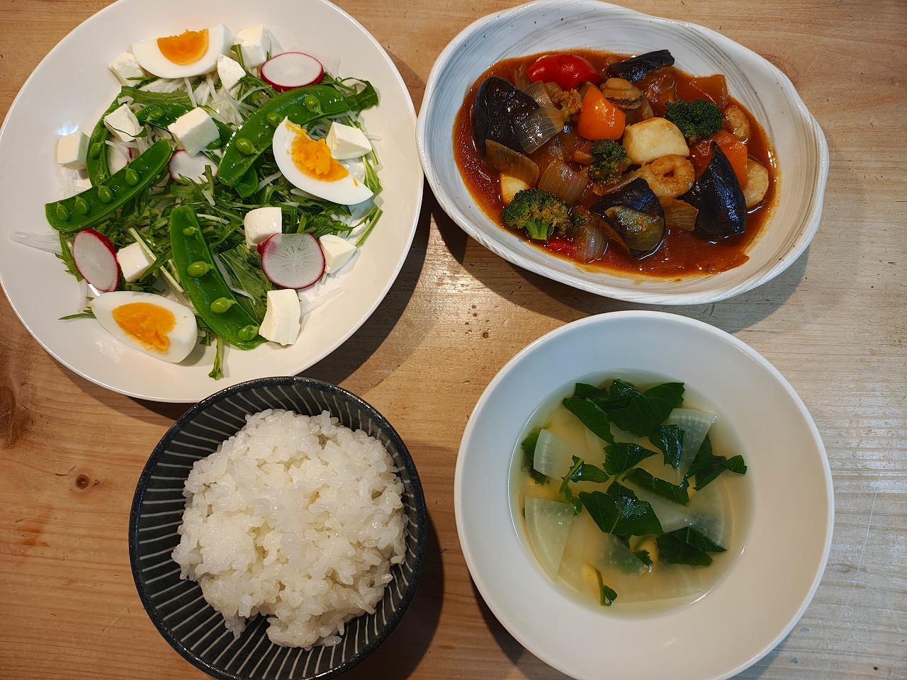 魚介のトマトソース煮 2026/3/14 2026/3/14 献立 夕ごはんの紹介です。 シーフードミックスと野菜を炒めて トマトソースで煮込みました。 火を通したら、シーフードが小さくなってしまった… 魚介の旨味がたっぷりで美味しい! 魚介のトマトソース煮 ゆで卵とモッツアレラチーズをのせて たんぱく質UP⤴⤴ 水菜とスナップエンドウのサラダ 大根スープ 魚介トマトソース煮の献立 ごちそうさまでした。 ブログランキングに参加しております。 よろしければポチッとお願いします。 にほんブログ村 家庭料理ランキング