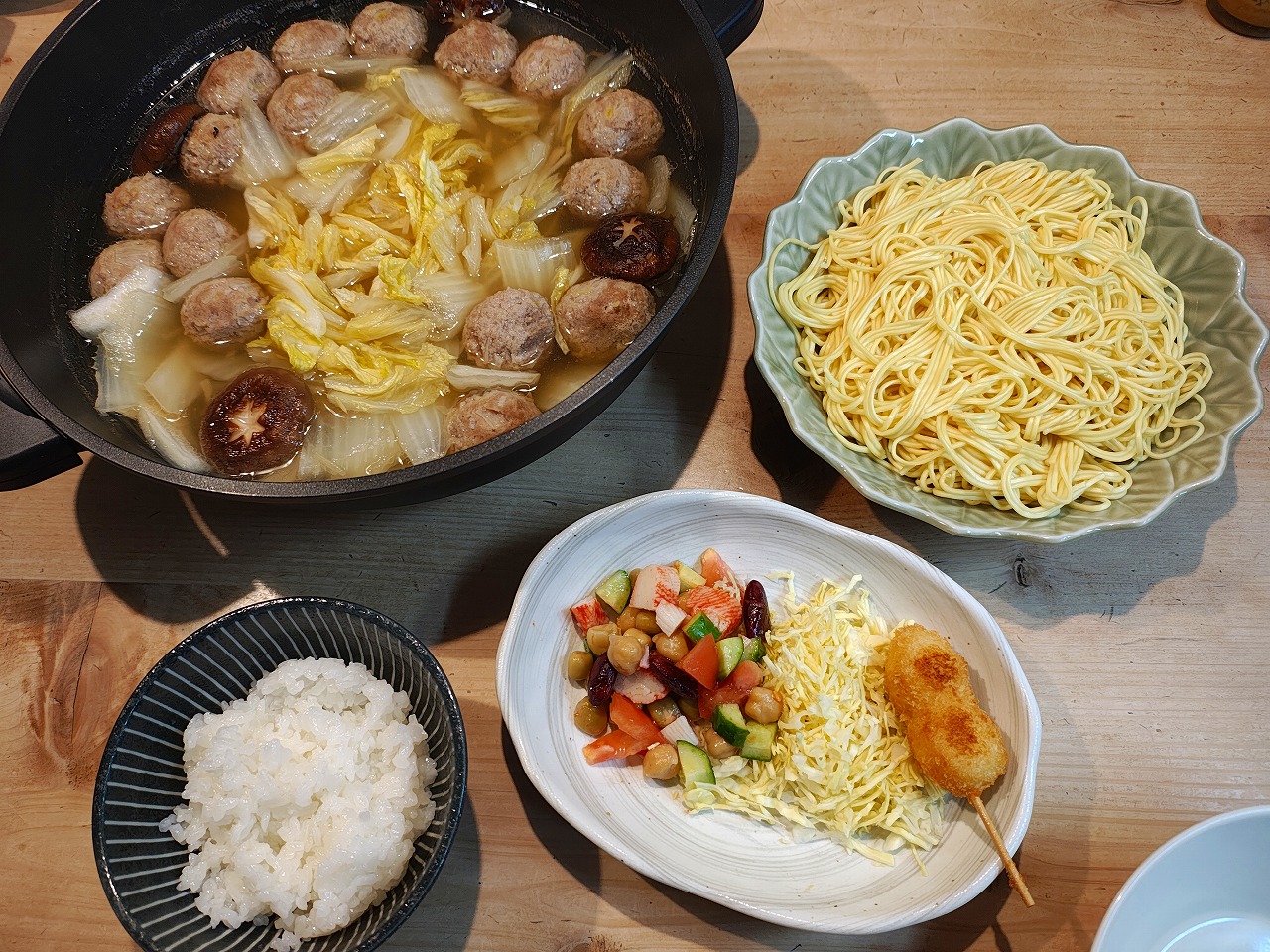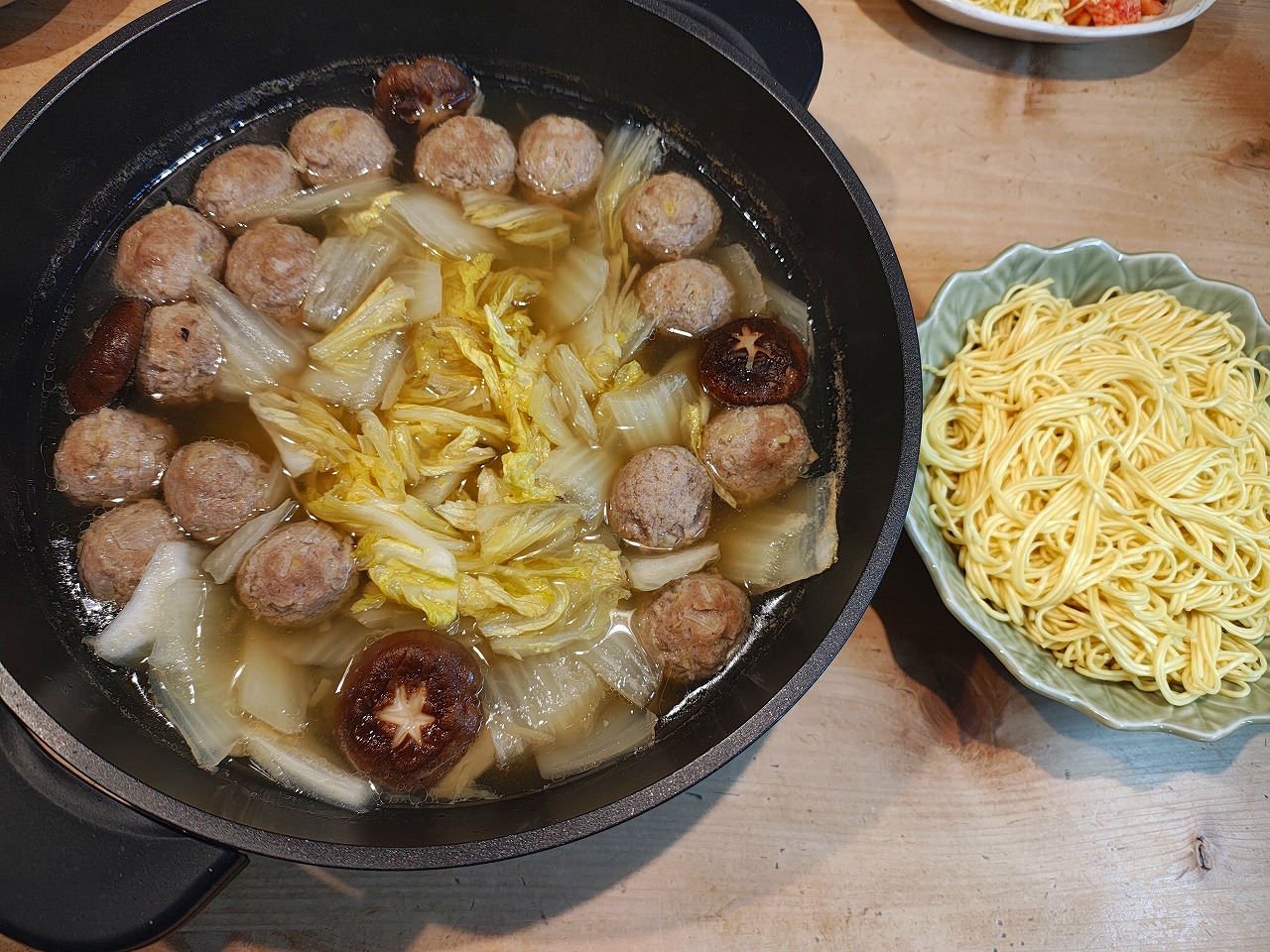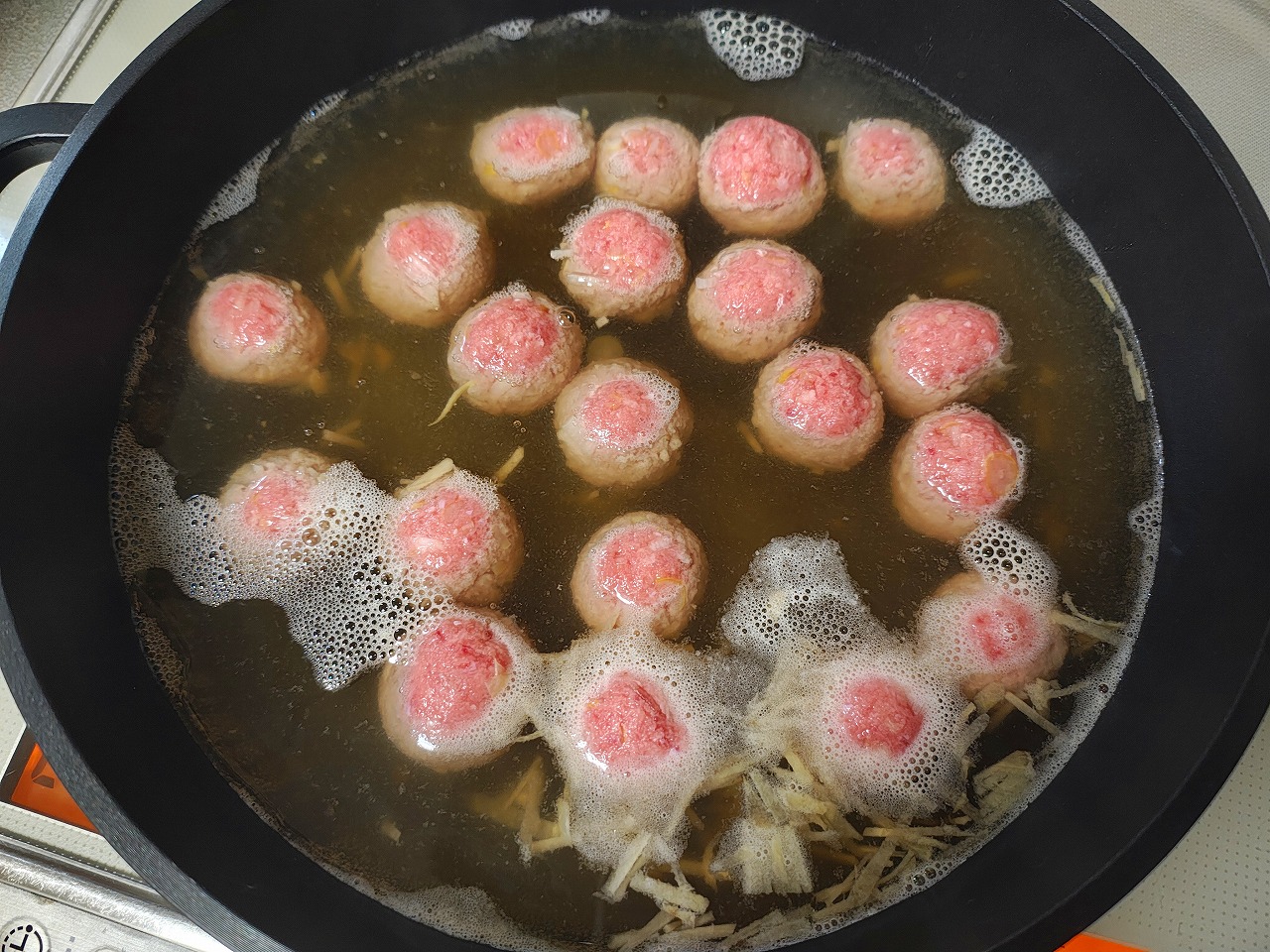 豚ひき肉、ネギ、生姜、醬油、酒、片栗粉を混ぜて団子を作り、