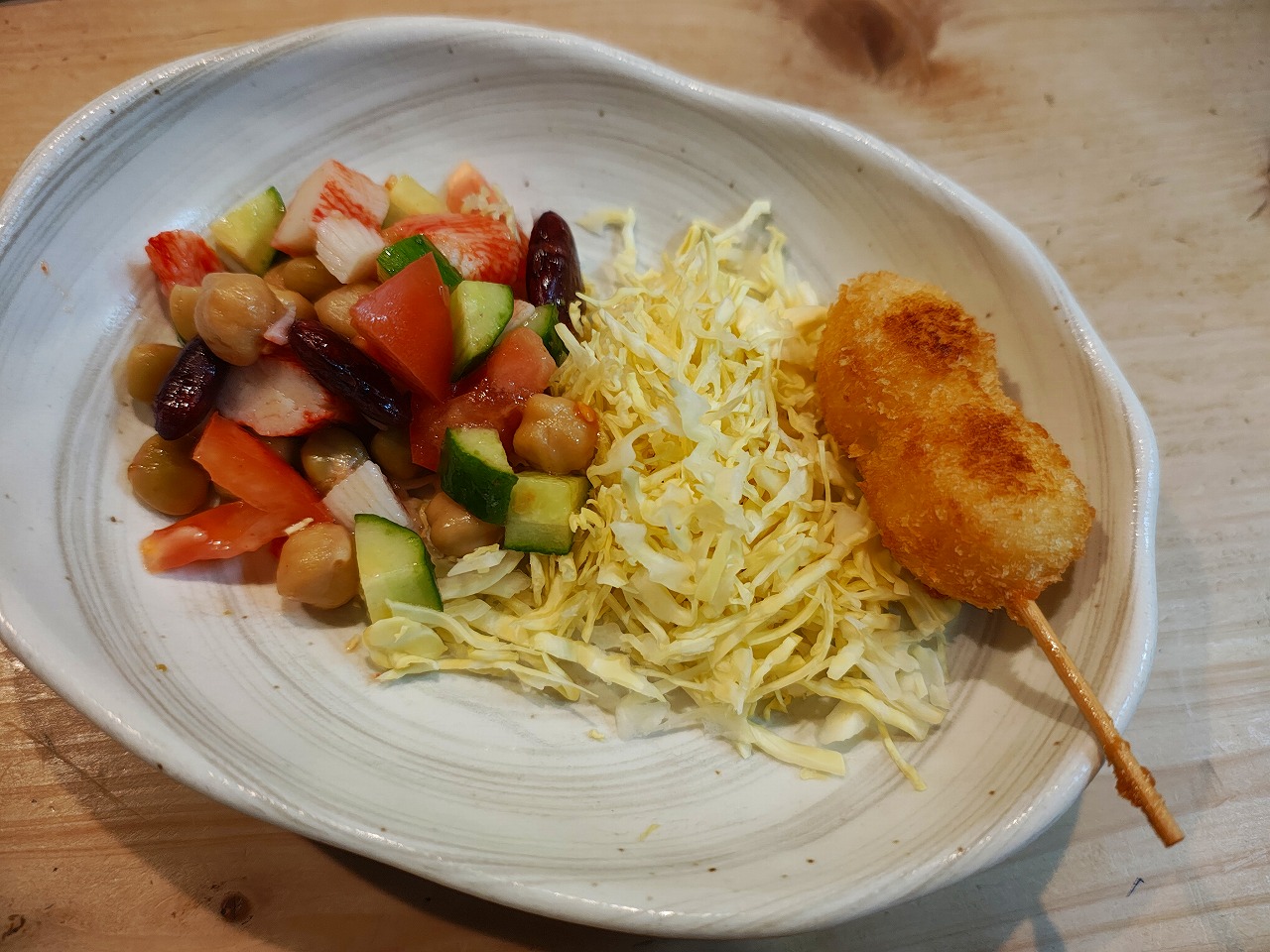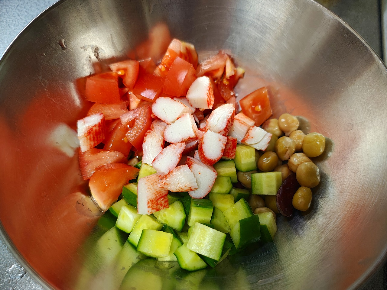 きゅうり、トマト、ミックスビーンズ、カニカマを合わせて