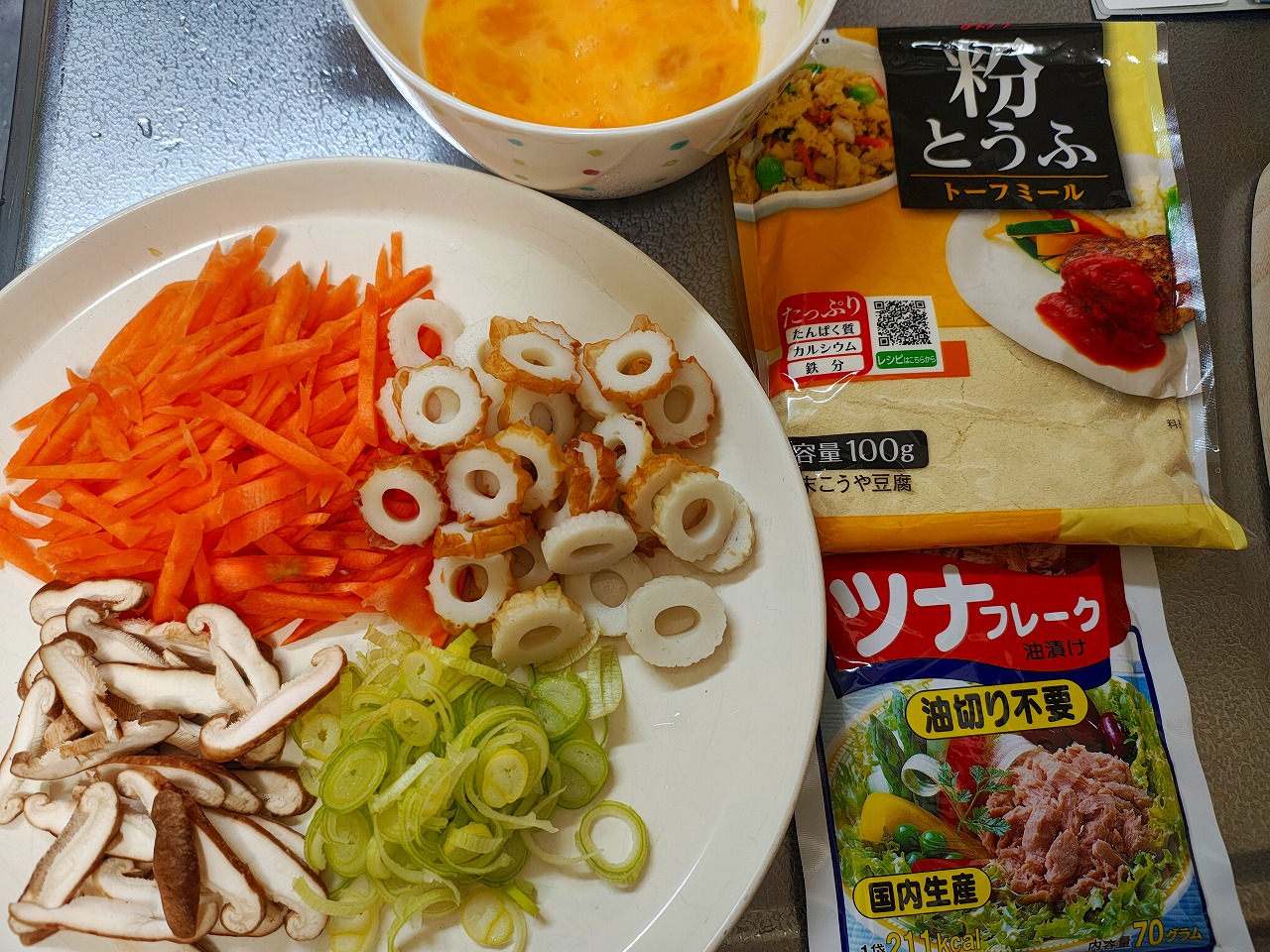 人参、しいたけ、ネギ、ちくわ、ツナを使いました。