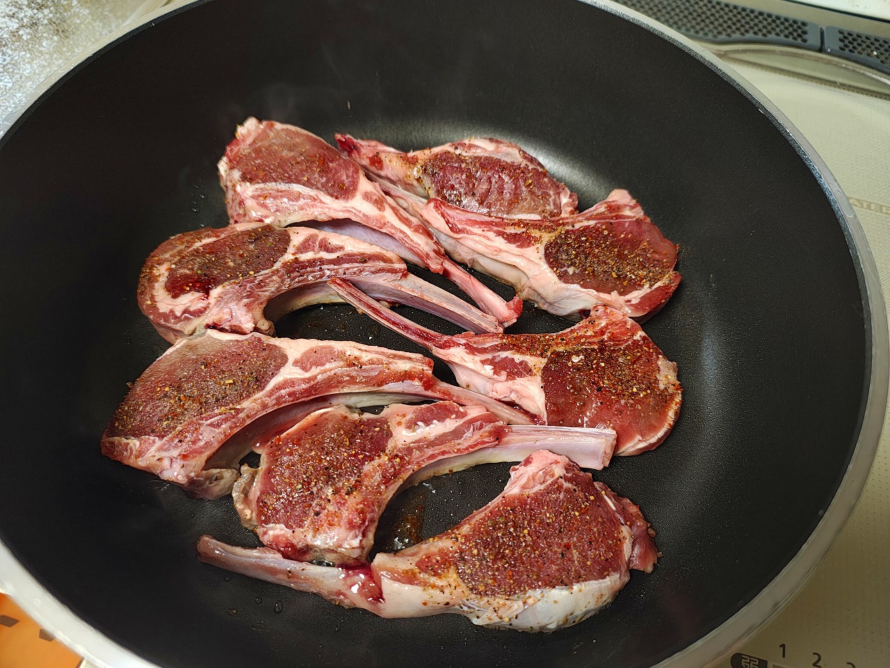 ラムの骨付き肉に塩こしょうをふって
