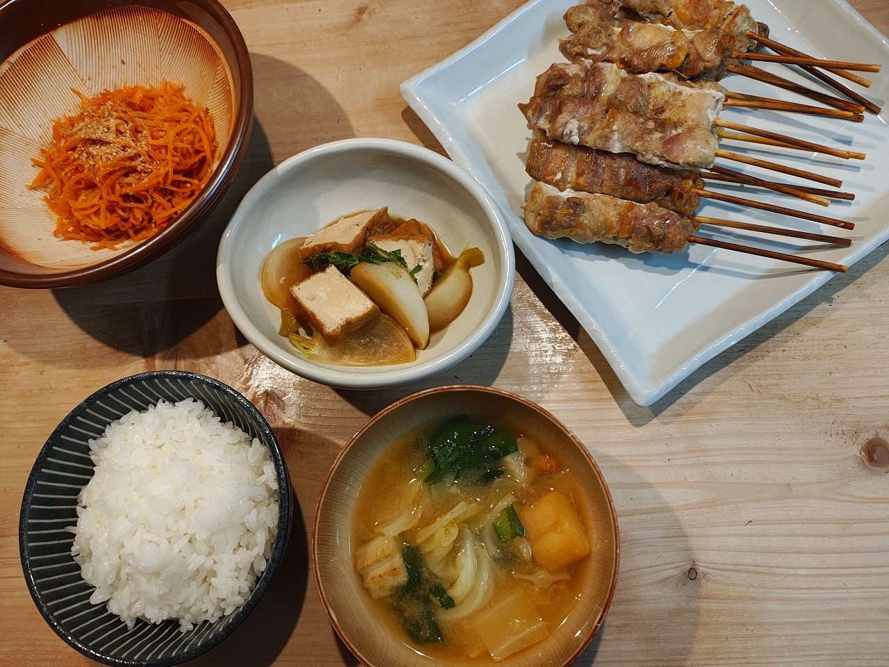 焼き鳥 2026/4/8 2026/4/8 献立 夕ごはんの紹介です。 鶏もも肉を串に刺したものを 魚焼きグリルで焼きました。 串は丸焦げになってしまうので、アルミホイルで蓋。 塩でさっぱり 焼き鳥 厚揚げと白菜の煮物 だしの味が厚揚げと白菜にしみ込んで、 ホッとする味です。 人参の胡麻和え お味噌汁 焼き鳥の献立 ごちそうさまでした。 ブログランキングに参加しております。 よろしければポチッとお願いします。 にほんブログ村 家庭料理ランキング