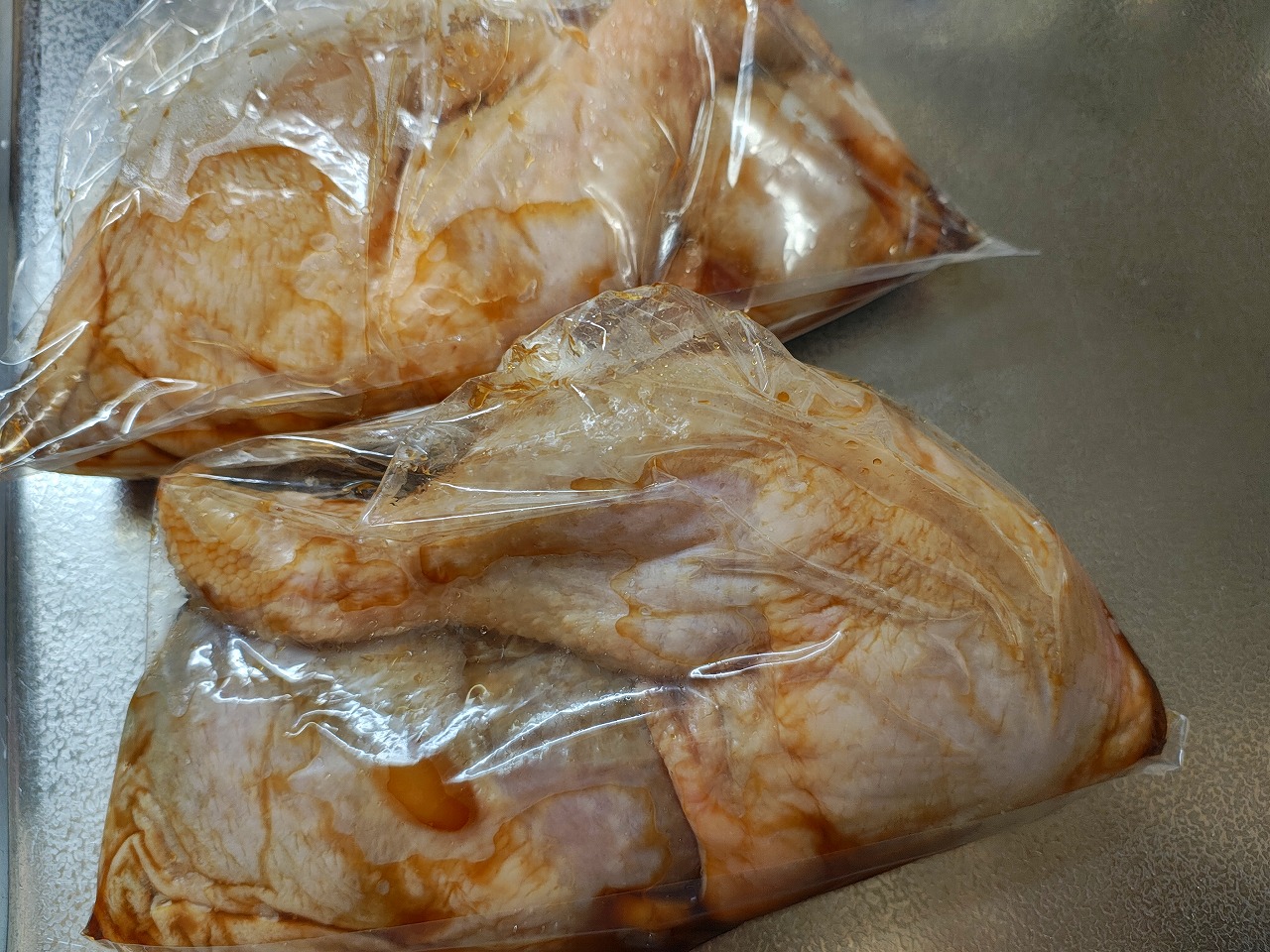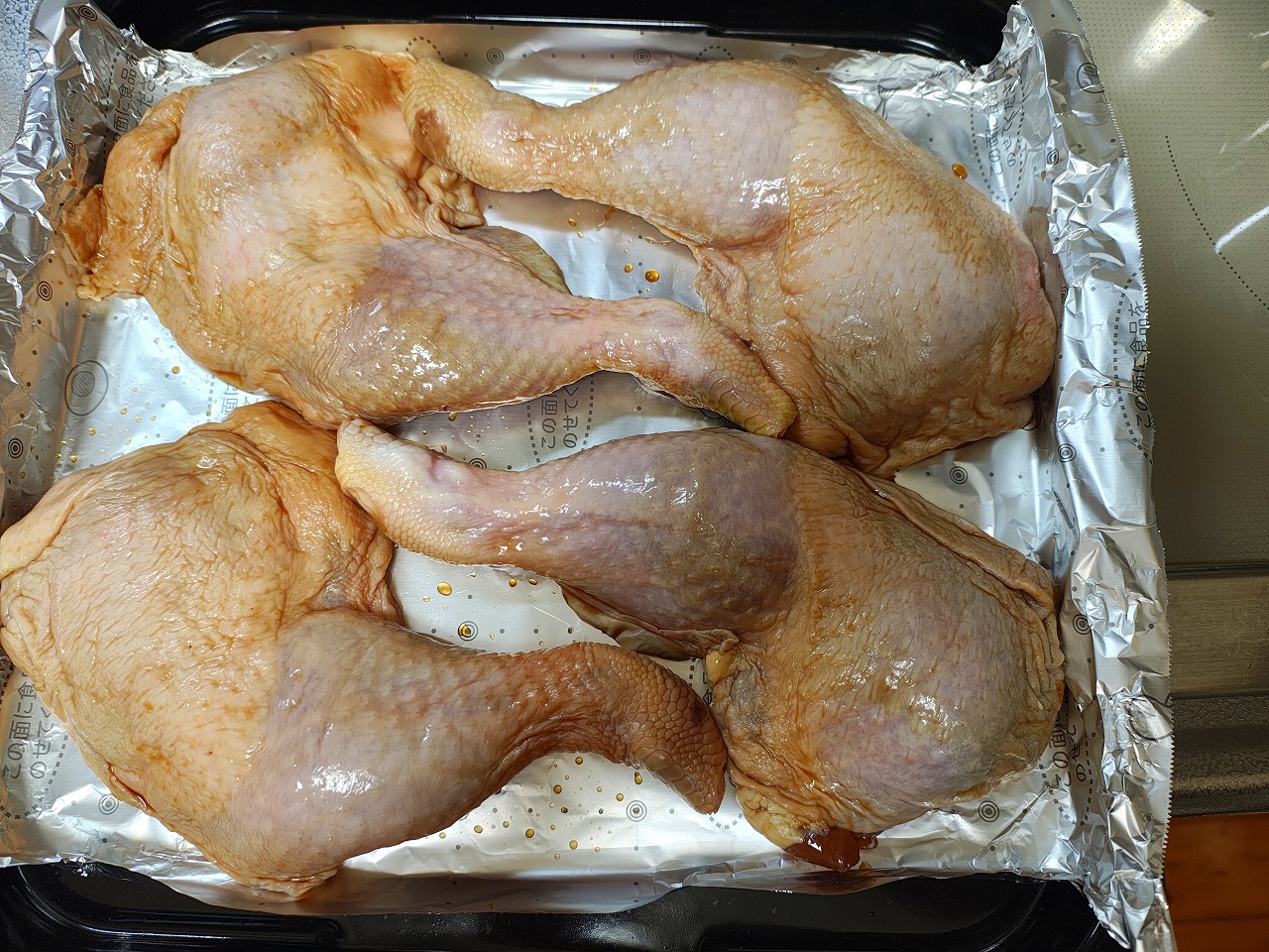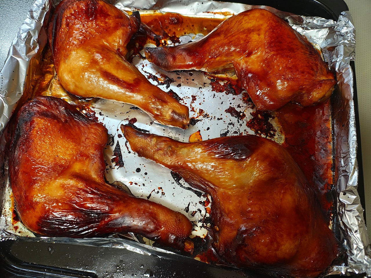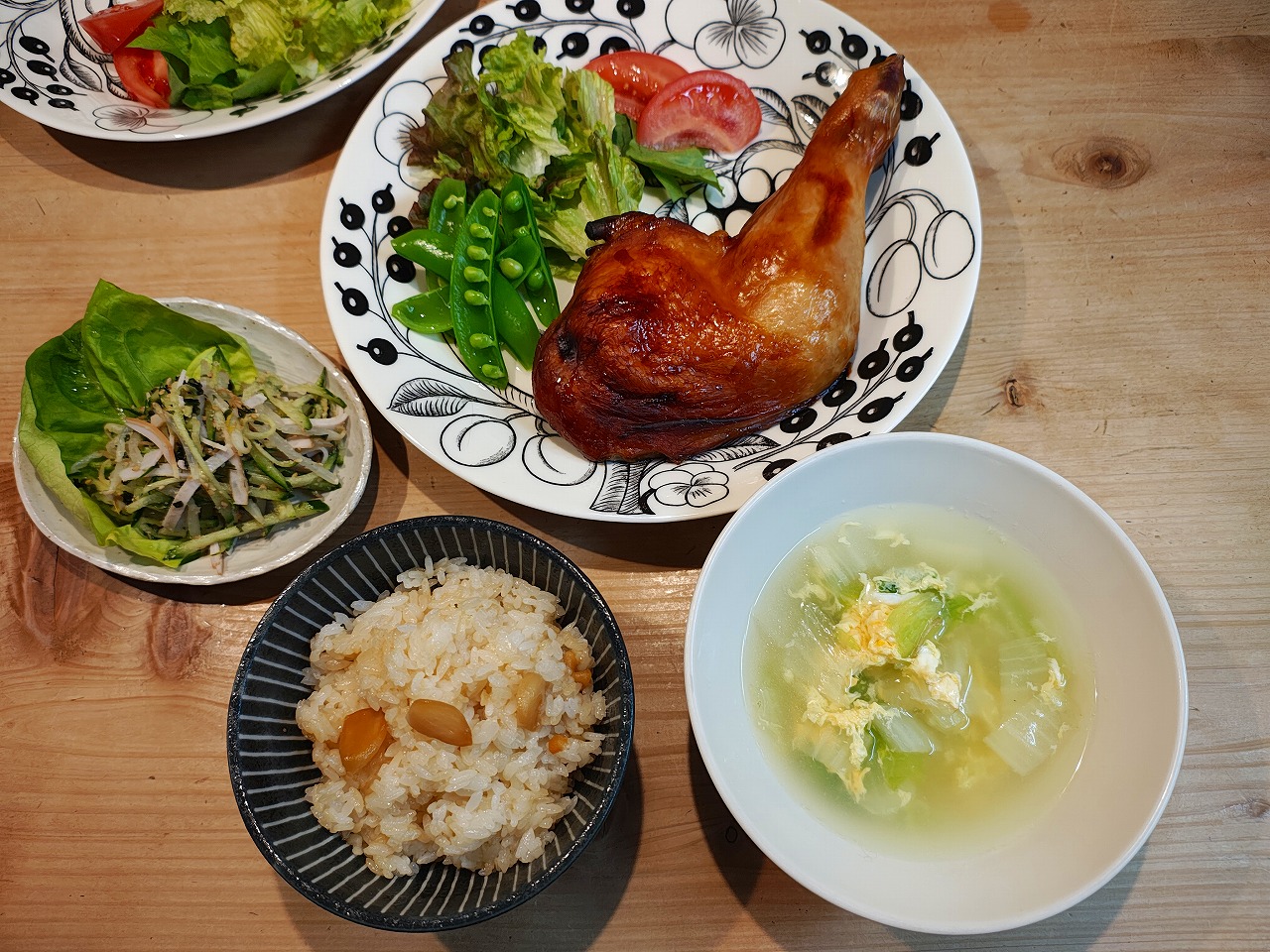 ローストチキン 2026/4/26 2026/4/26 献立 夕ごはんの紹介です。 前日に鶏もも肉をタレに漬け込んでおきました。 【醬油、砂糖、はちみつ、酒、生姜、にんにく】 天板にのせて 200℃に予熱しておいたオーブンで40分 ローストチキン 骨付き肉は食べにくいですが、 ジューシーです👍 特別感もありますね~✨ もやし、きゅうり、ハム、わかめごはんの素、 すりごま、醬油、ごま油を合わせて もやしとハムのサラダ ガーリックライス 白菜と玉子のスープ ローストチキンの献立 ごちそうさまでした。 ブログランキングに参加しております。 よろしければポチッとお願いします。 にほんブログ村 家庭料理ランキング