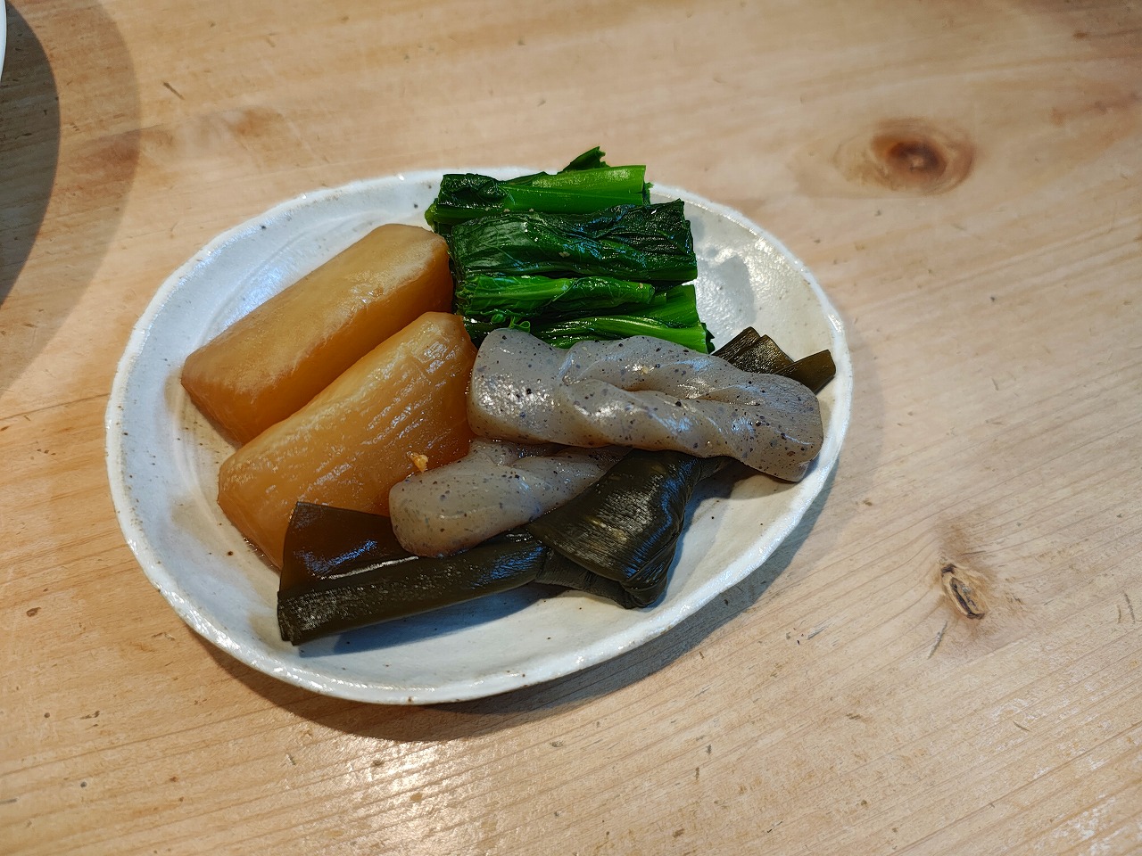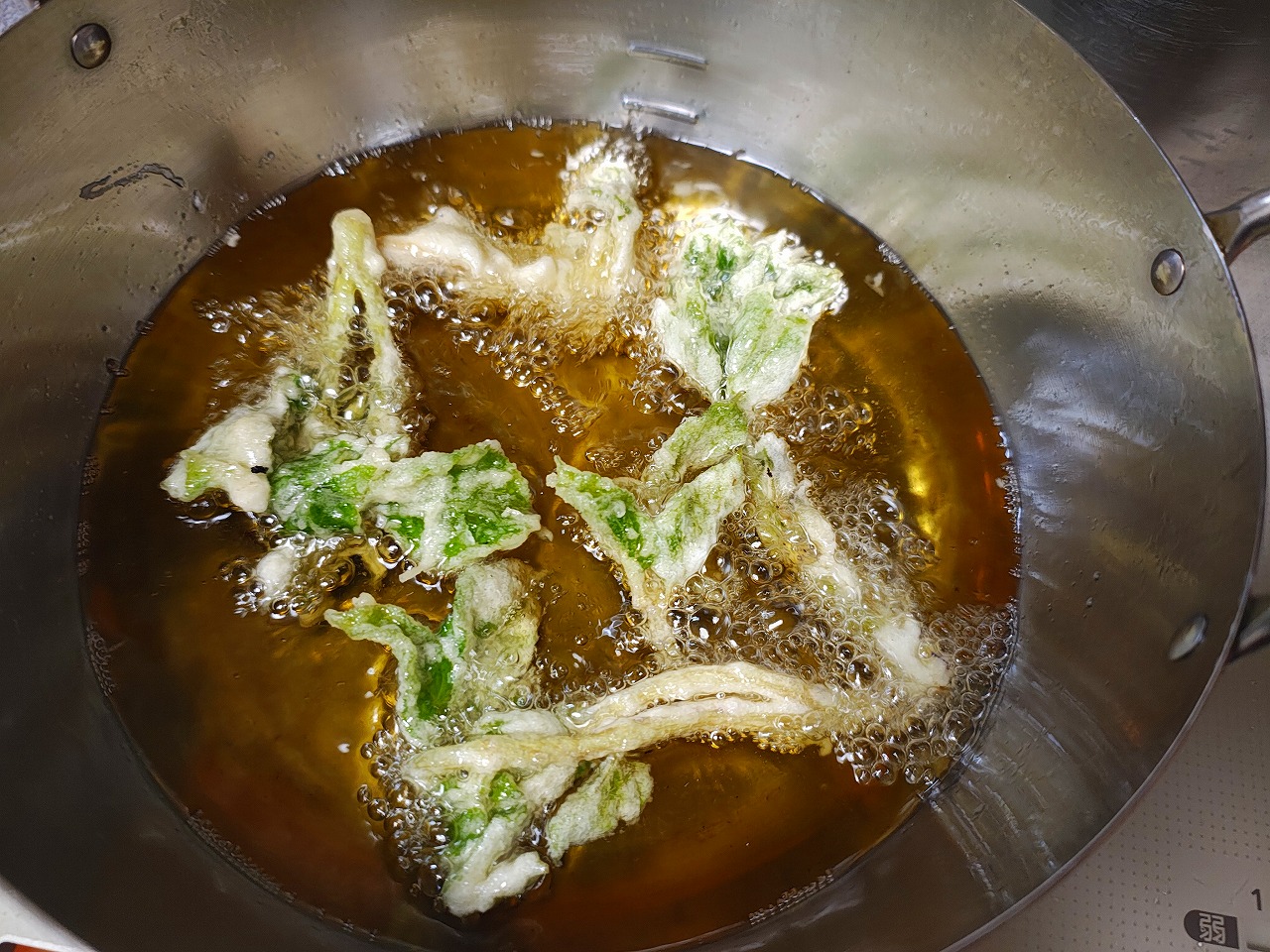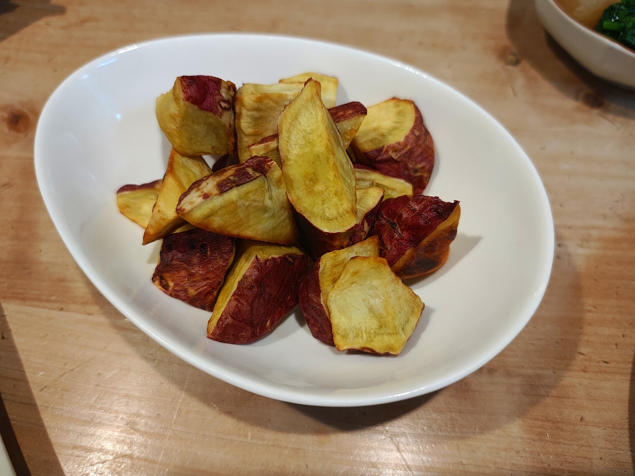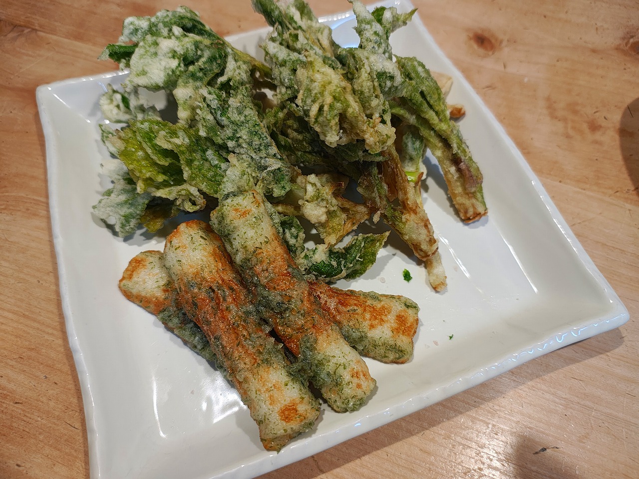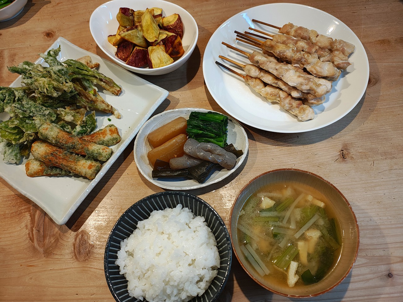 うどの天ぷらと焼き鳥 2026/4/15 2026/4/15 献立 実家からもらってきたうど 新鮮なうちは葉っぱの緑がきれいです🍃 衣をつけて揚げました。 うどの天うら&ちくわの磯辺揚げ 少しでもカロリーを抑えるために 衣はつけず。 サツマイモの素揚げ 串に刺した鶏もも肉を 魚焼きグリルで焼きました。 串は焦げるので、アルミホイルでカバーしておきます。 焼き鳥 こんにゃくと大根の煮物 こちらに添えた青菜も実家から。 弘法菜 です。 お味噌汁 うどの天ぷら&焼き鳥の献立 ごちそうさまでした。 ブログランキングに参加しております。 よろしければポチッとお願いします。 にほんブログ村 家庭料理ランキング