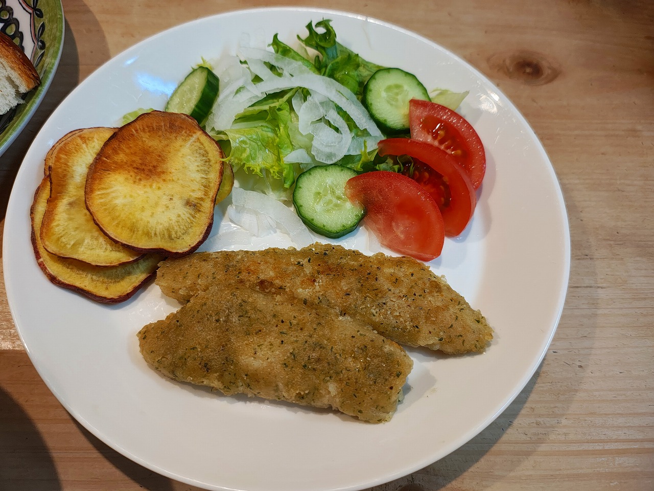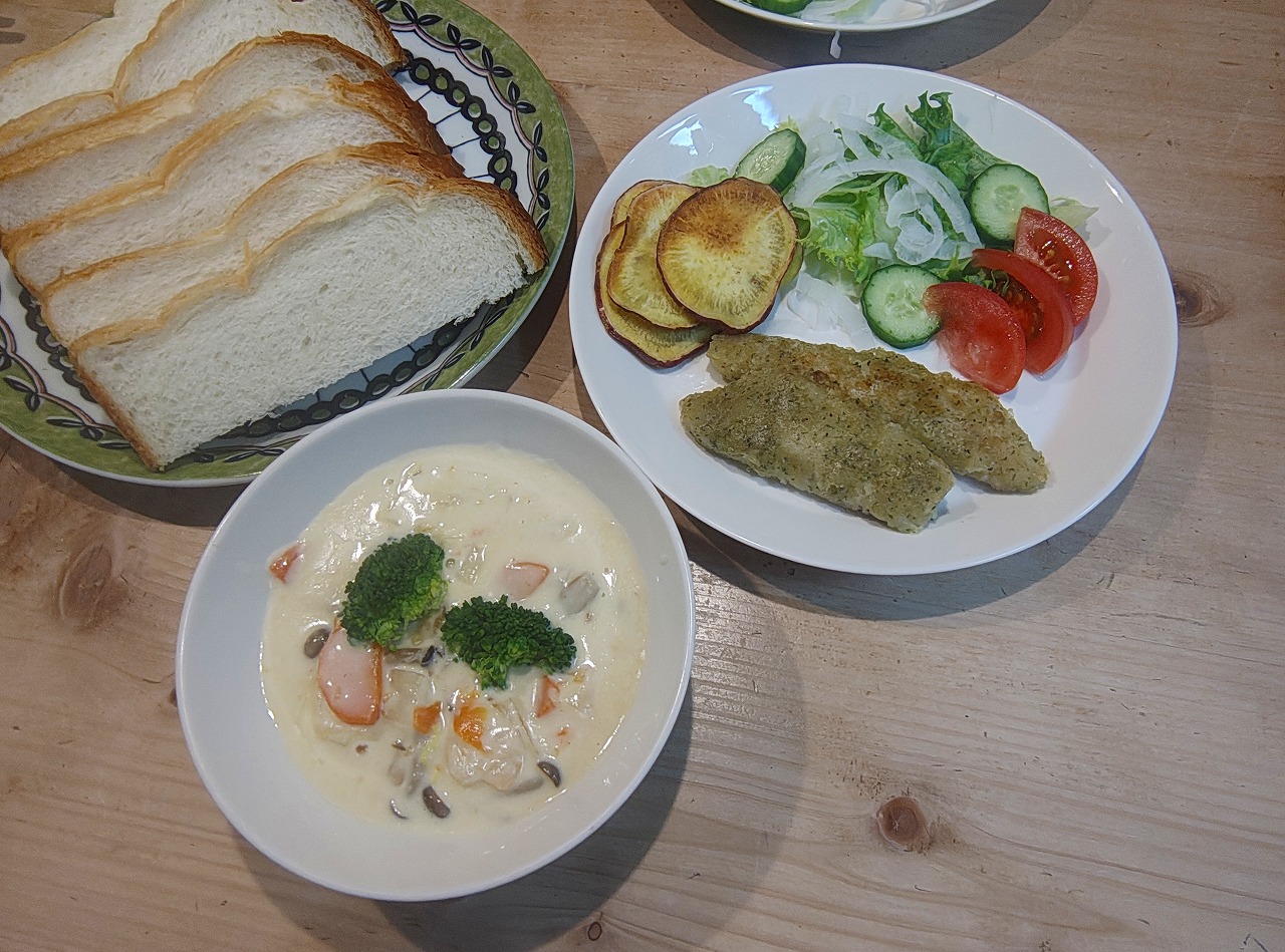 カレイのソテー 2026/4/29 2026/4/29 献立 夕ごはんの紹介です。 カレイの三枚おろしに薄力粉と乾燥バジルをまぶして フライパンで焼きました。 カレイのバジル焼き 付け合わせは生野菜サラダと さつまいもチップ シーフードミックス、 玉ねぎ、白菜、人参、しめじを具に 具沢山のミルクスープ 具沢山のスープで栄養満点 カレイのバジルソテーの献立 ごちそうさまでした。 ブログランキングに参加しております。 よろしければポチッとお願いします。 にほんブログ村 家庭料理ランキング