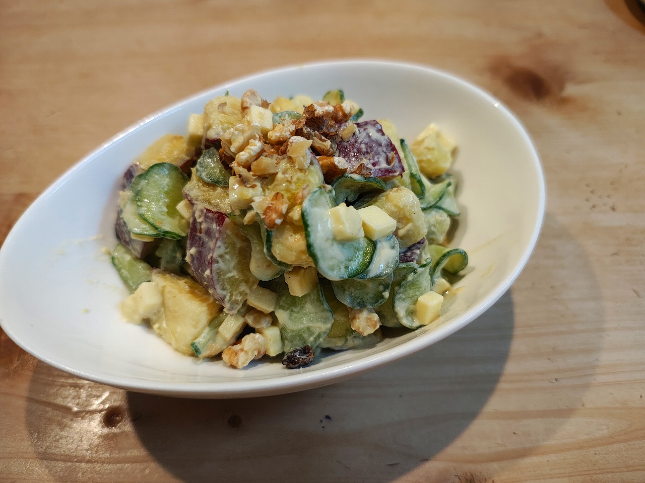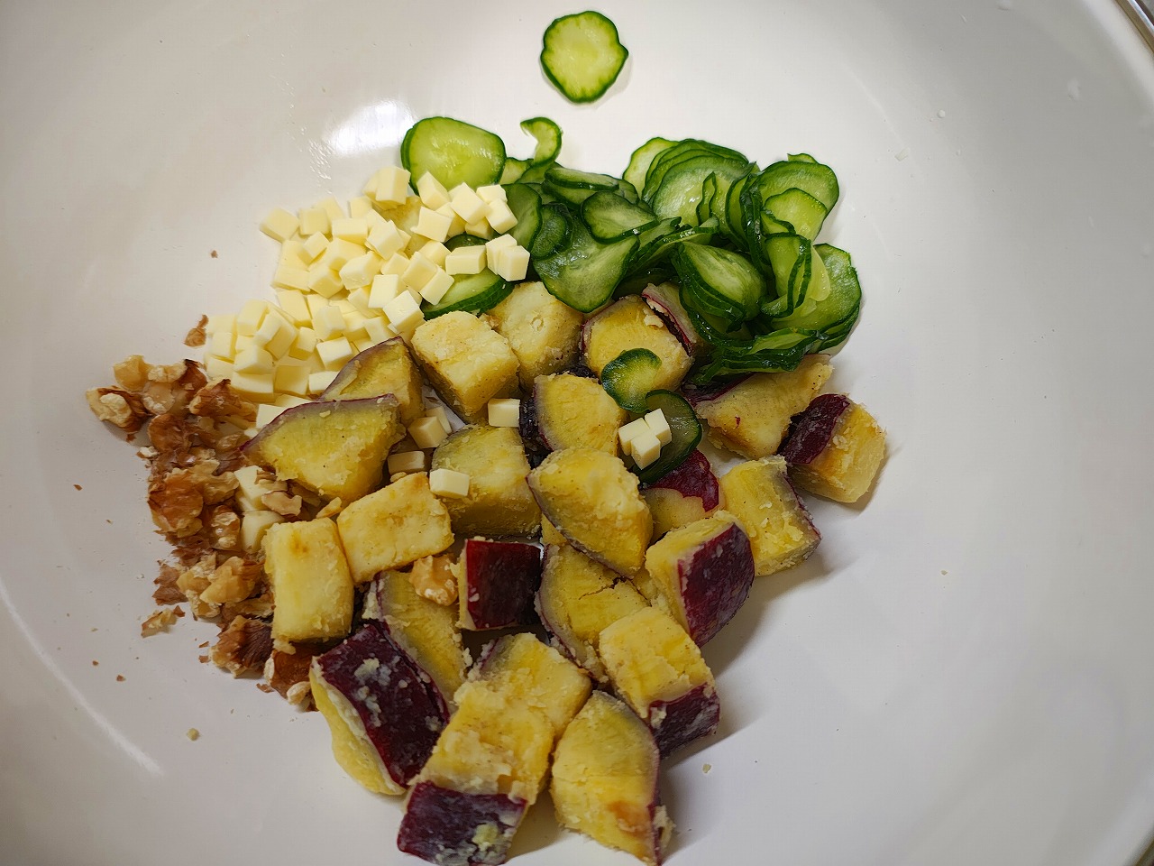 きゅうり、レーズン、チーズ、クルミを合わせて