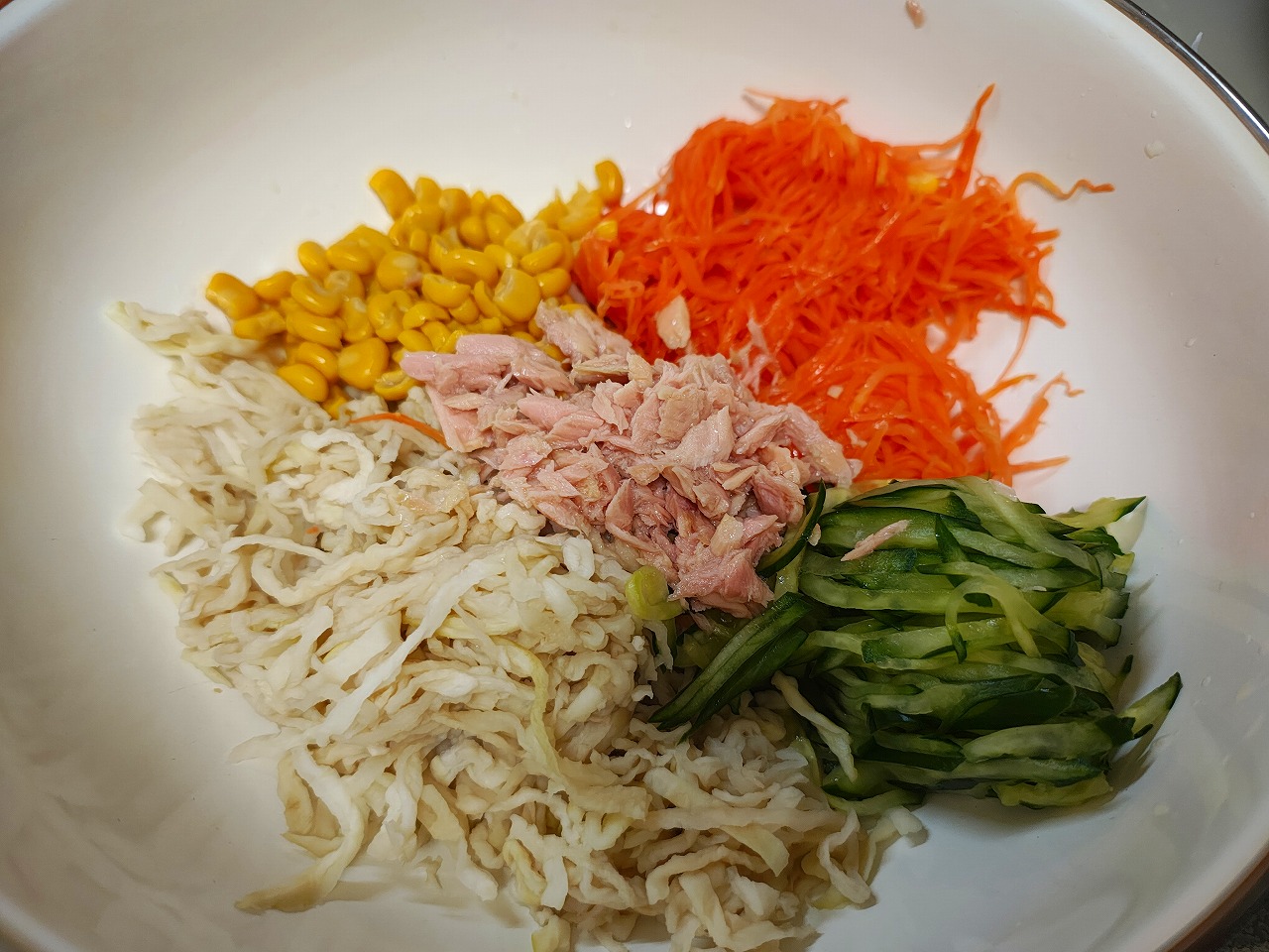 切り干し大根、人参、きゅうり、コーン、ツナを合わせて