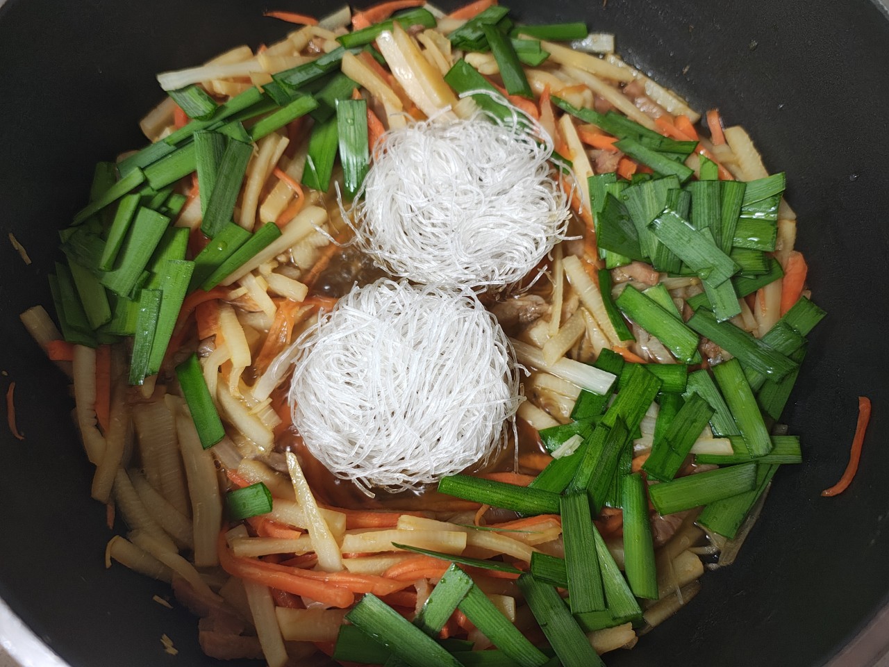 そこにニラと乾燥したままの春雨を入れます。